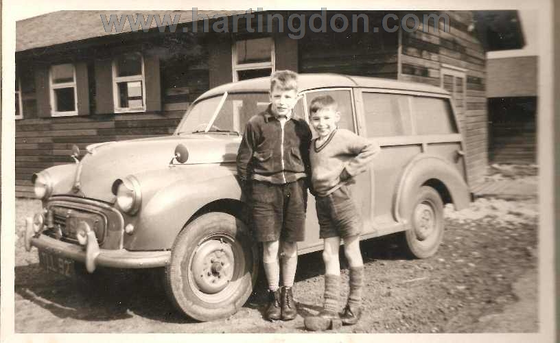 The car, a split screen Morris minor, is thought to belong to Don Robinson. It appears to be parked at the end of one of the dorms.