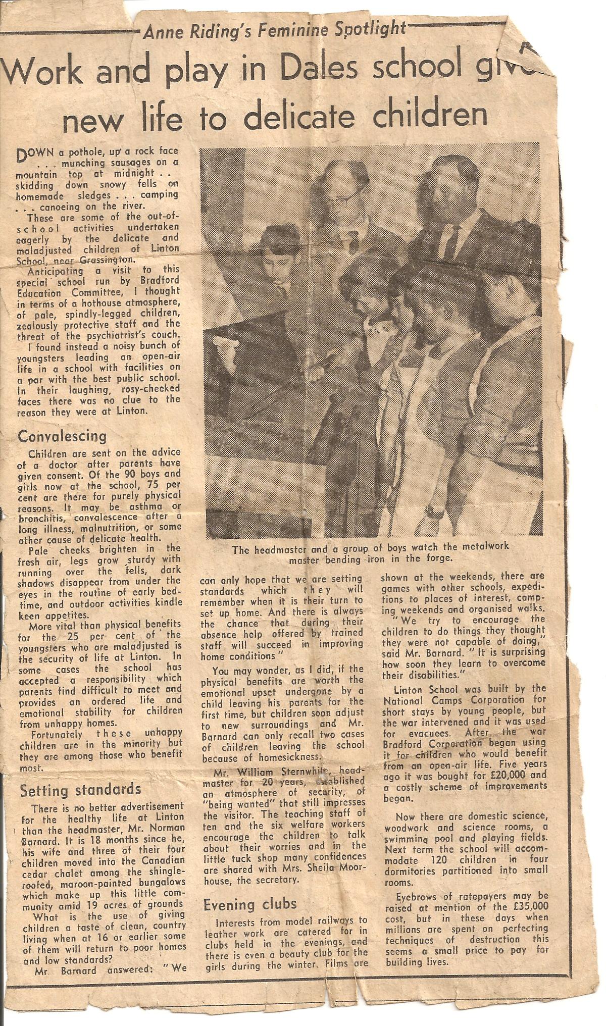 Linton School was built by the National Camps Corperation for short stays by young people, but the second world war intervened and it was used for evacuees. After the war, Bradford Corperation began using it for children who would benefit from an open air life. Five years ago it was bought for £20,000 and a costly scheme of improvements began. Now there are domestic science rooms, woodwork and science rooms, a swimming pool and playing fields. Next term the school will accomodate 120 children in 4 dormitories partitioned into small rooms.