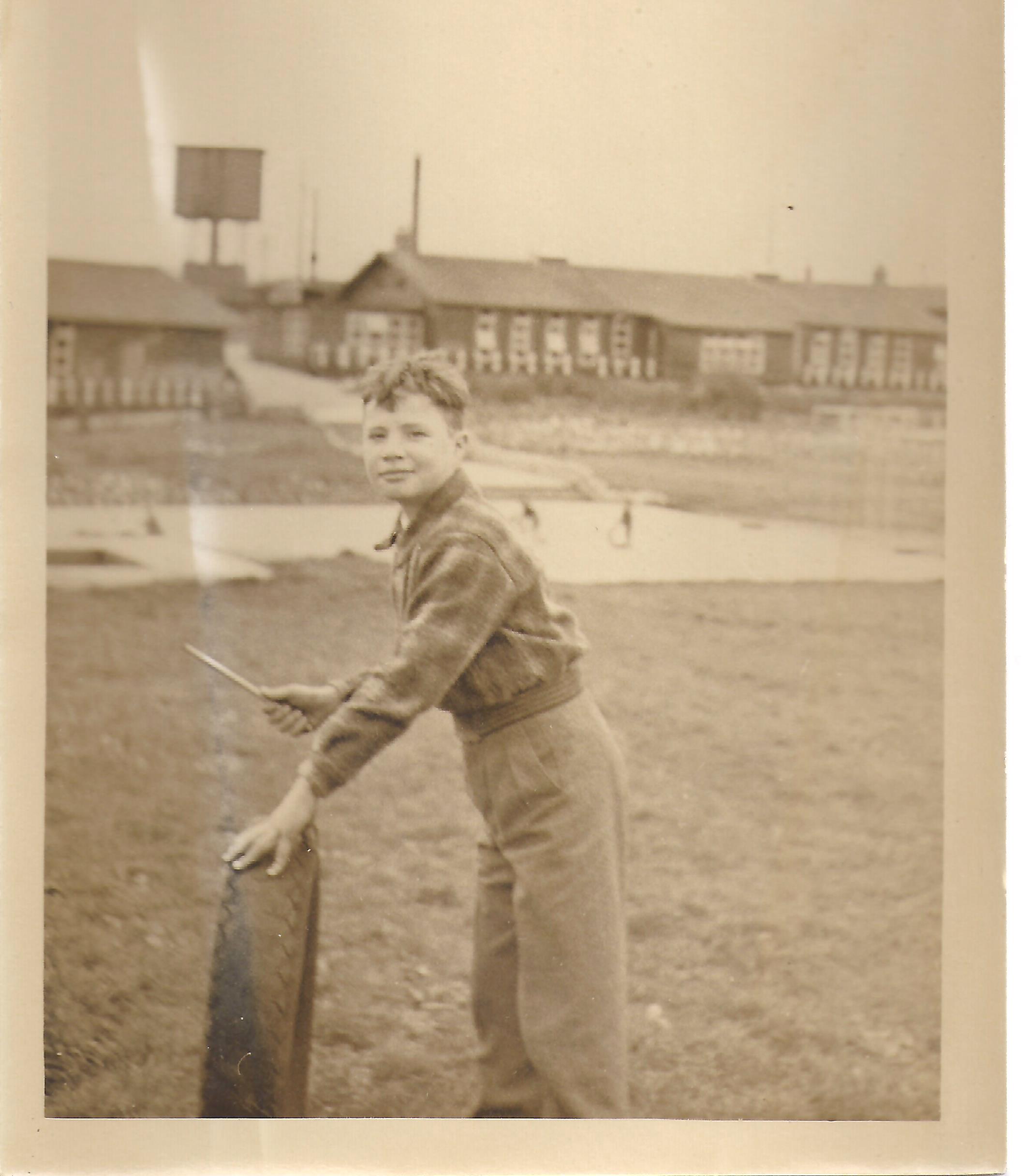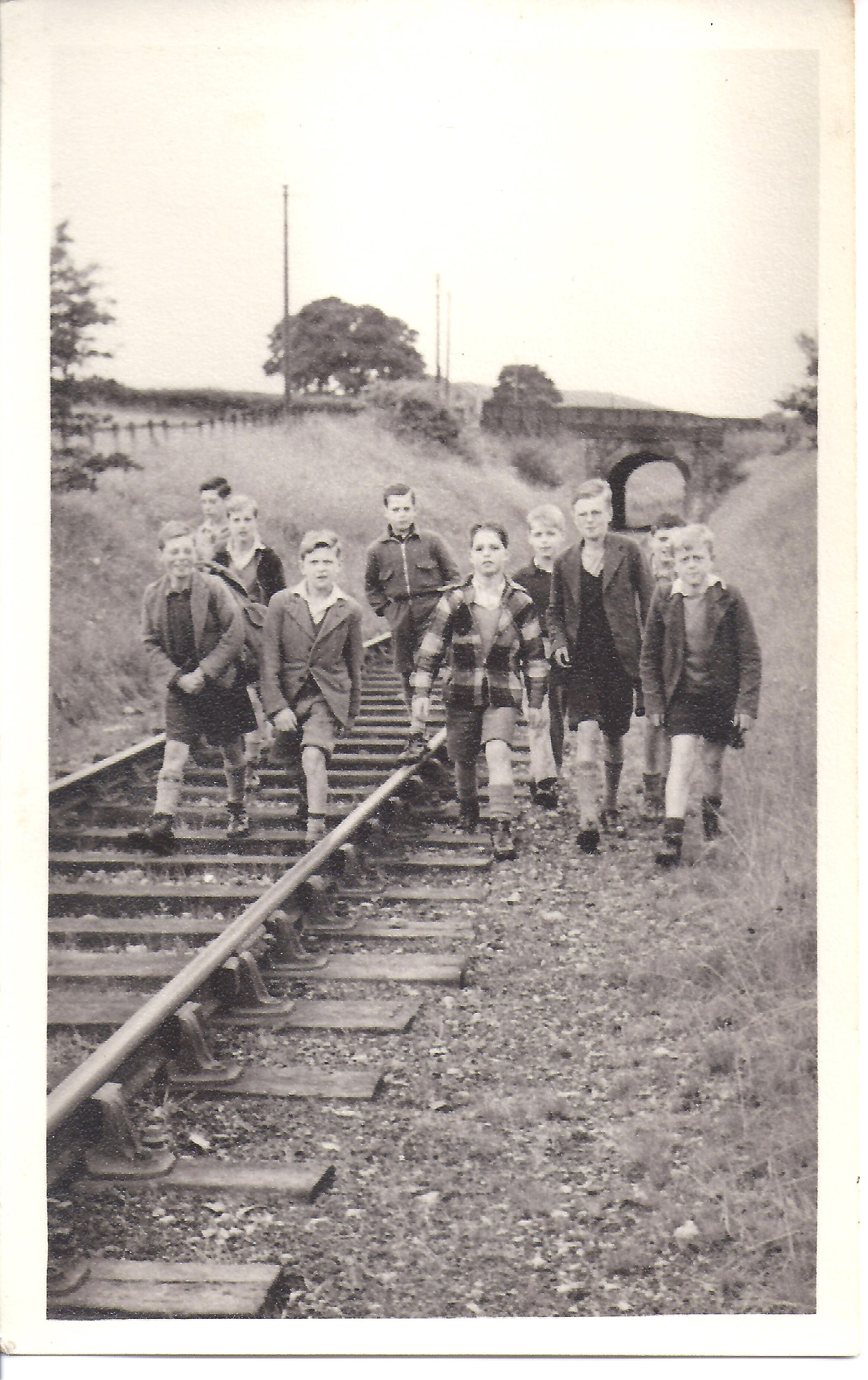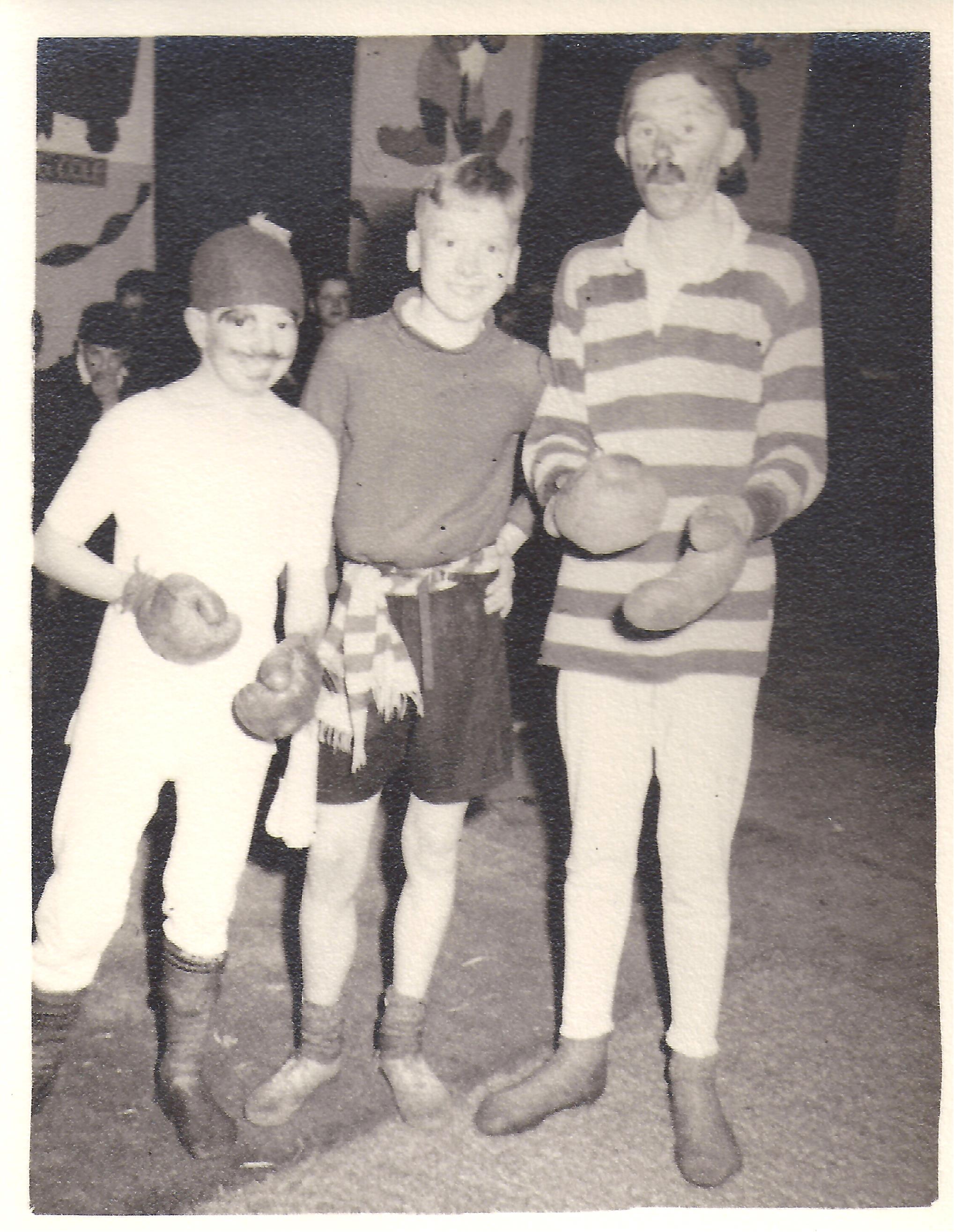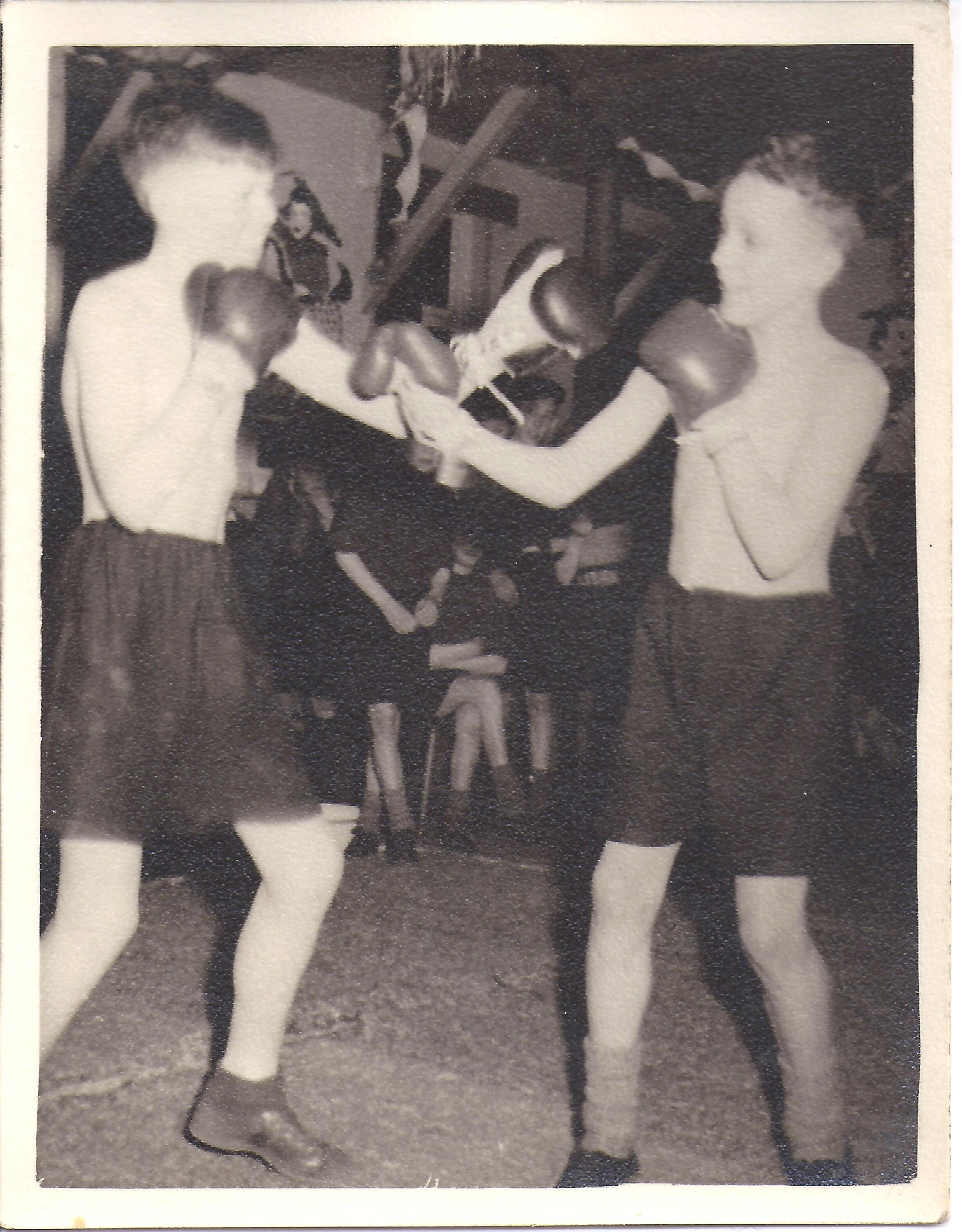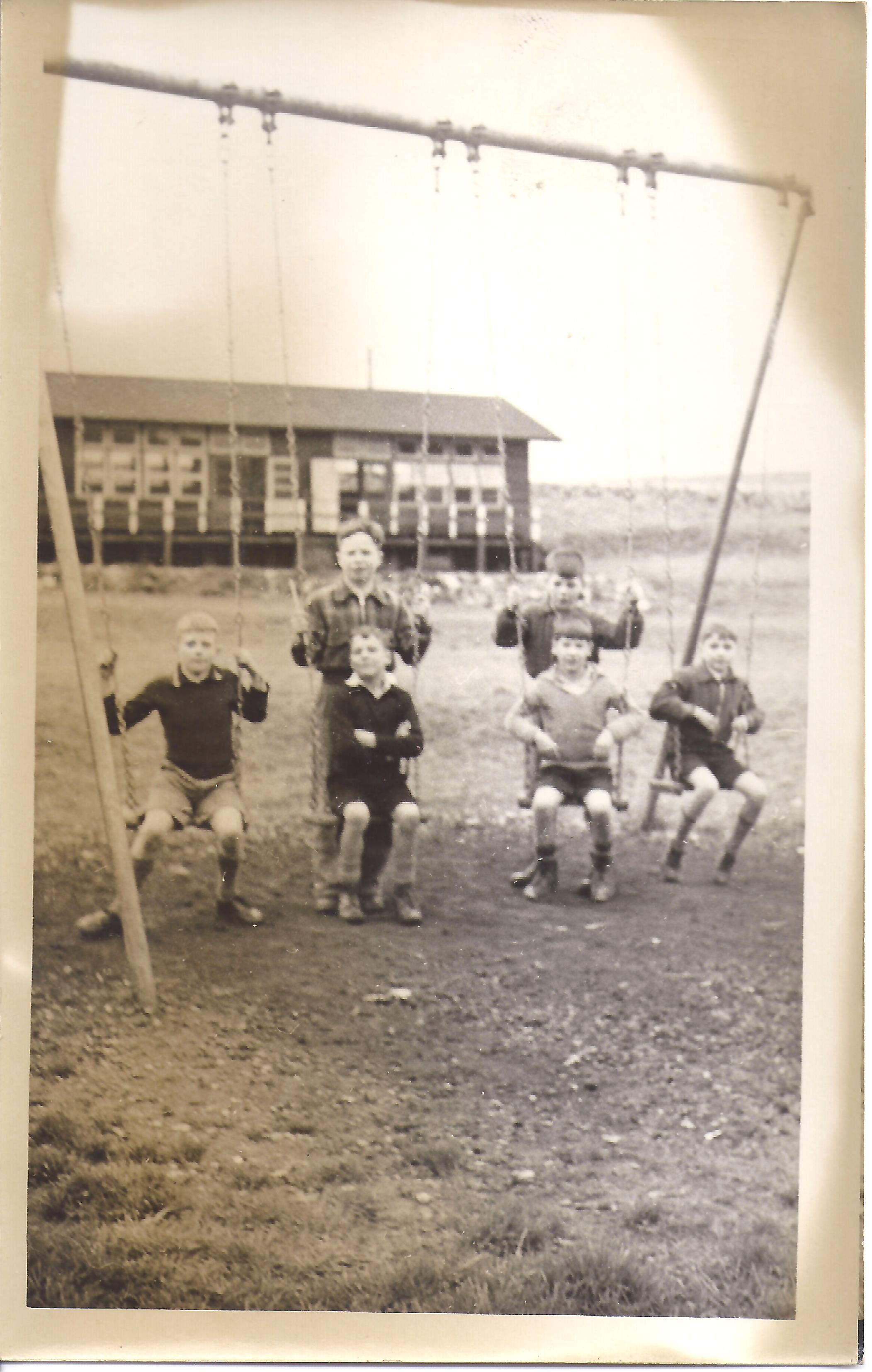 Grassington Branch boys taking a walk Mr Sternwhite is thought to be with them.PE on the square.Boy stood next to his tyreBoys pretending to box, probably pantomime time.Pantomine boxers in 1951The swings and classroom block